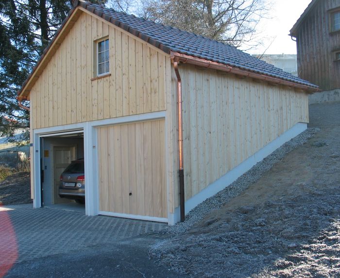 Die Bauherrschaft wollte eine preiswerte Doppelgarage bauen, hatte aber Bedenken, ob auf diese Weise mit günstigen Fertiggaragen gearbeitet werden könnte. Dies war jedoch mit Pfaff-Fertiggaragen überhaupt kein Problem. Die Kipptore konnten problemlos mit einer passenden Holzverschalung ausgerüstet werden. Die von aussen sichtbaren Betonwände wurden einfach mit lokalen Holzbrettern verkleidet. Auf diese Weise sind die Pfaff-Fertiggaragen absolut "Heimatschutz-konform" und alle Beteiligten sind absolut zufrieden.