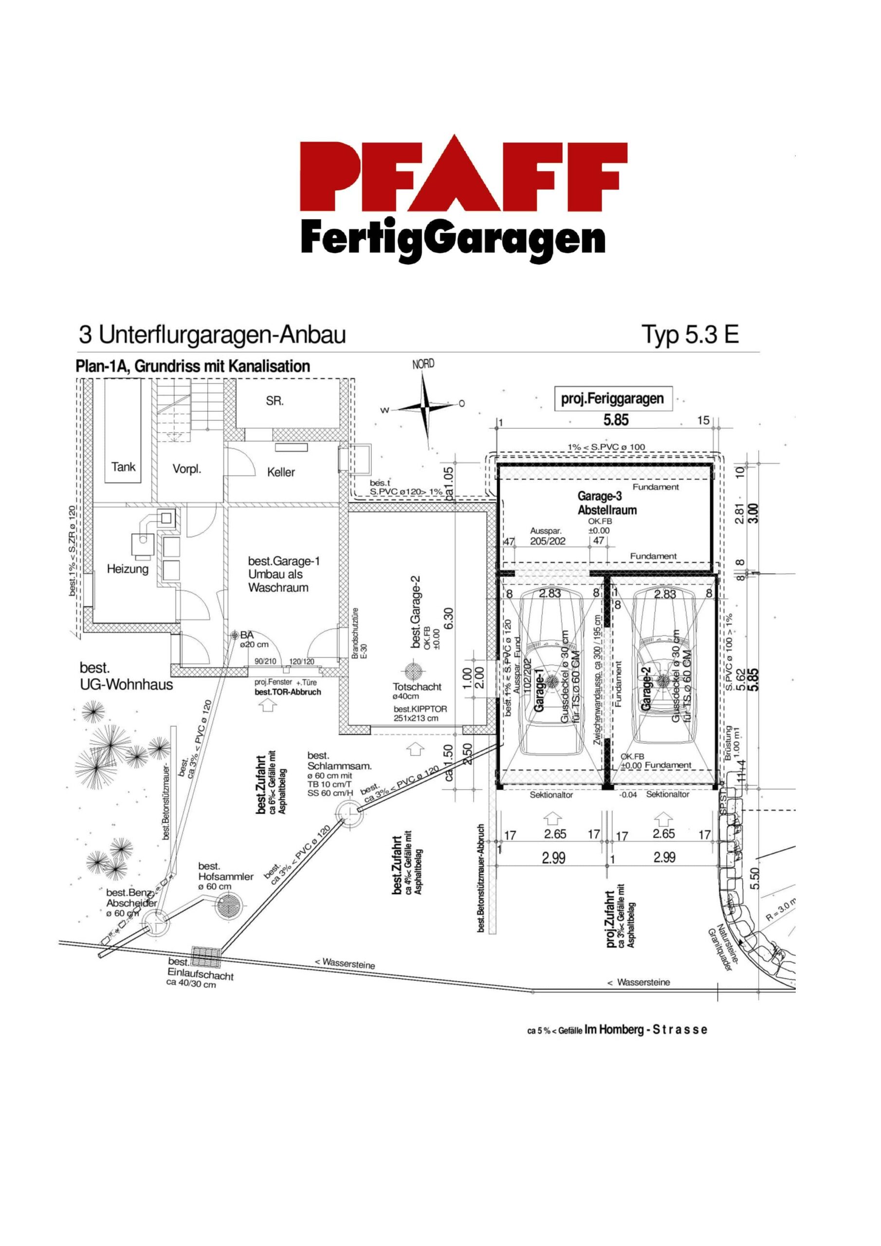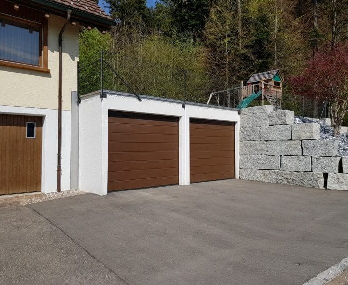 Unser Kunde verfügte über eine grosse Bauparzelle, "am Waldrand" mit Einfamilienhaus und Einzelgarage. Nun sollte Platz für zwei weitere Fahrzeuge sowie ein geräumiger Abstellraum dazu gebaut werden. Die Firma PFAFF hat einen entsprechenden Vorschlag gemacht und diesen mit Plänen sauber dokumentiert. Die neue Doppelgarage wurde auf der Rückseite mit einem weiteren Element ergänzt, um den benötigten Abstellraum zu schaffen. Alle drei Elemente sind mittels einer "Türe" direkt in das bestehende EFH erschlossen. Dies bringt den Eigentümern einen raschen und komfortablen Zugang zu den neu erstellten Räumen. Der Kunde war begeistert und hat den Auftrag für die Baueingabe an die PFAFF AG vergeben. Die Baubewilligung wurde rasch erteilt, und die Bauausführung konnte termingerecht in Angriff genommen und fertiggestellt werden. Nach sehr kurzer Bauzeit wurde das Projekt beendet und die drei Massiv-Beton Elemente konnten den zufriedenen Kunden übergeben werden. Sehen Sie selbst!