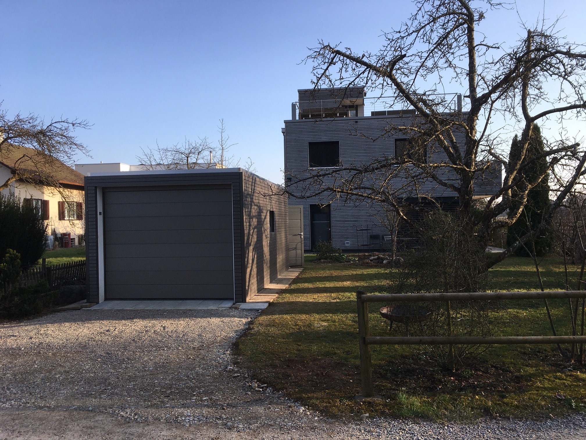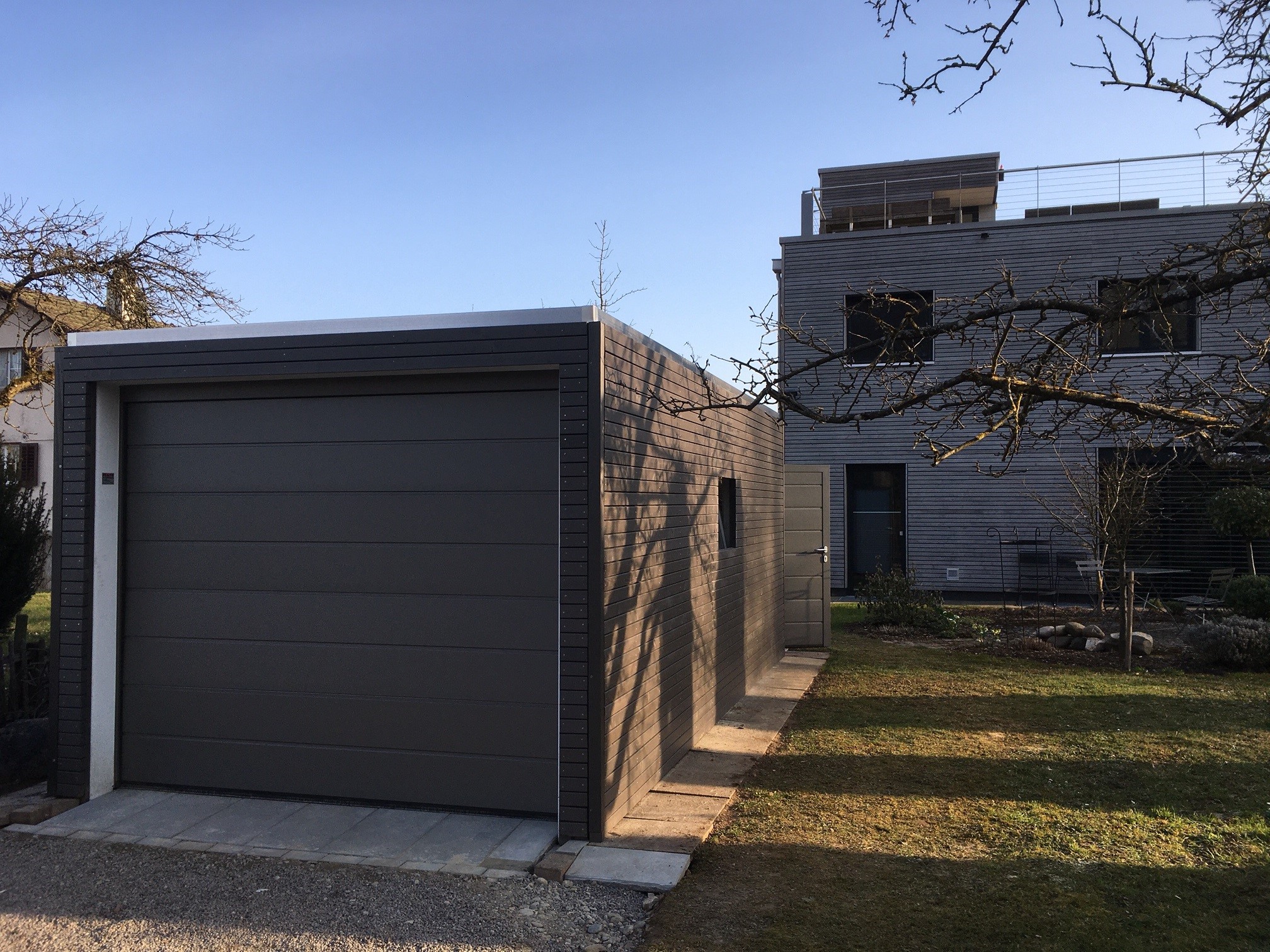 Sektionaltor in RAL 9007 Graualuminium, Oberfläche in Silkgrain (Seidenglatt) und elektrisch bedienbar