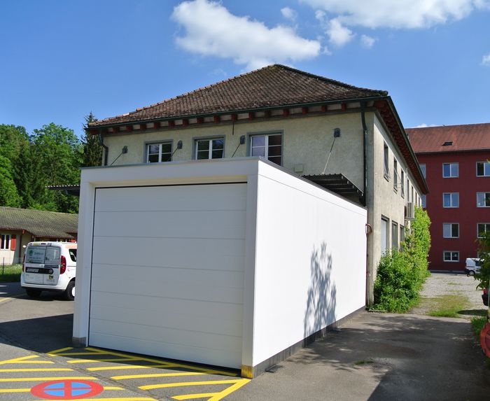 Das neue Rettungsfahrzeug benötigte einen sicheren, sauberen und trockenen Parkplatz. Die Spitalverwaltung wollte dies so rasch wie möglich und preisgünstig realisieren. In Frage kam ein bestehender Teerplatz. Es sollte vermieden werden, teure und aufwändige Fundamente dafür erstellen zu müssen. Deshalb hat die PFAFF AG eine Garage auf Mass, jedoch ohne Betonboden vorgeschlagen. Diese optimale Lösung hat den Planer überzeugt, weil damit alle Vorgaben rasch und preiswert erfüllt werden konnten. Die neue Garage steht absolut stabil auf sechs Stück Stahlplatten, welche vorher auf dem Asphaltplatz ausgelegt worden sind. Auf diese Weise kann das Rettungsfahrzeug schwellenlos auf den bestehenden Platz ein- und ausfahren.
