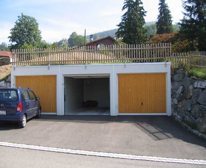 In ländlicher Umgebung sollte hier einfach Platz für drei Autos erstellt werden (an einer Stelle, wo vorher eben kein Platz war). Die drei Garagen sollten vermietet werden, in diesem Falle ist neben dem Standort das wichtigste Merkmal der Garagen eine genügende Durchfahrtshöhe beim Garagentor (Garagen mit ungenügender Durchfahrtshöhe gibt es leider schon genug). Die Kipptore mit Holzverbretterung passen sehr gut in die Landschaft und verfügen über eine Durchfahrtshöhe von 2.12 m! Somit eignen sich diese Garagen auch zum Parkieren von Familien-Vans oder auch beispielsweise für einen VW-Bus mit Dachträger. Dank dieser Torhöhe kann wirklich jeder Interessent resp. Mieter “sein Fahrzeug” in diesen Garagen platzieren.